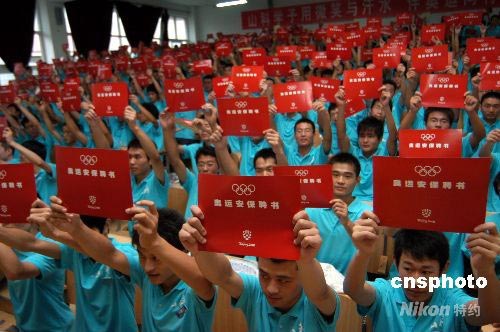 圖:濰坊志愿者領(lǐng)取北京奧運(yùn)會(huì)安保聘書