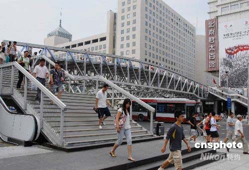 2008年7月20日,行人通過北京西單天橋。當天,經(jīng)過改建、新建后的北京西單商業(yè)街區(qū)天橋正式投入使用。西單商業(yè)街改造工程共建新橋兩座、一個連廊,改建舊橋兩座。其中新1號橋是目前世界上最大的高強度全鋁合金天橋,主橋長84米,寬8米,兩側(cè)四個方向共8部上行電動扶梯,照明系統(tǒng)采用了先進的LED燈,美觀、節(jié)能、環(huán)保。中新社發(fā) 耿玉和 攝