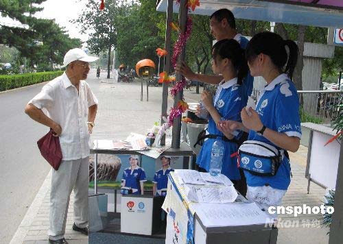 7月21日,以大學(xué)生為主體的奧運(yùn)志愿者們,在100多個由中國移動通信援助的“北京奧運(yùn)會志愿者服務(wù)站亭”中,為市民和中外游客解答奧運(yùn)比賽場館及交通服務(wù)知識。中新社發(fā) 鄒憲 攝