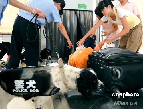 為確保二00八北京奧運(yùn)會(huì)青島奧帆賽的安全,青島火車(chē)站鐵路公安處引進(jìn)德國(guó)邢偵犬、比利時(shí)緝毒犬、英國(guó)搜爆犬等犬種,對(duì)客貨物品進(jìn)行嚴(yán)格檢查,在青島火車(chē)站廣場(chǎng)上巡邏盤(pán)查可疑人員。圖為旅客進(jìn)站物品通過(guò)安檢后搜爆犬再次把關(guān)。 中新社發(fā) 曲連遵 攝