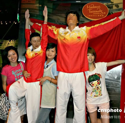 7月29日,上海杜莎夫人蠟像館,游客與新?lián)Q了裝的劉翔、郭晶晶蠟像合影。該蠟像館緊跟形勢,在北京奧運會中國體育代表團領獎服公布后,新近為劉翔、郭晶晶進行了換裝,立刻引來游客的好奇,紛紛駐足觀看并上前與之合影留念。中新社發(fā) 沈晨 攝