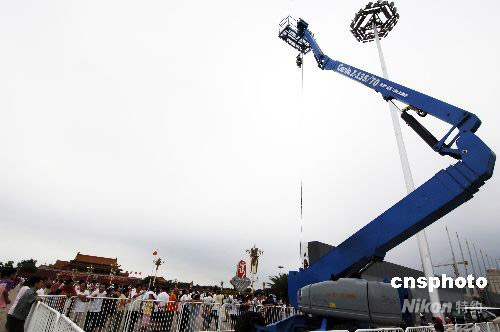 7月29日,美國一家電視臺動用云梯空中拍攝天安門廣場迎奧運盛況。據(jù)報道,北京在奧運會期間對天安門廣場上的直播報道亮起綠燈,不過僅限于獲得奧運轉(zhuǎn)播權(quán)的官方電視公司。根據(jù)相關(guān)協(xié)議,外媒直播報道時段被安排在早上6點到10點以及晚上9點到11點。其他媒體也可以在天安門廣場進(jìn)行報道,但不能直播。 中新社發(fā) 王東明 攝