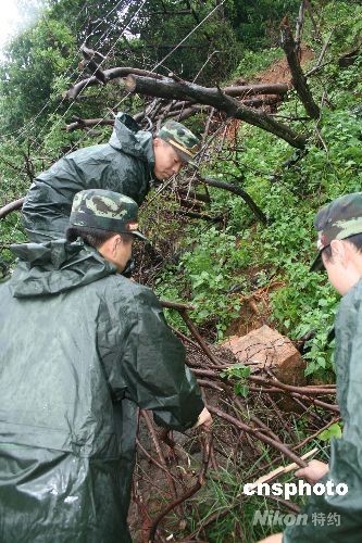 七月三十日,福建泉州邊防支隊(duì)官兵在福建泉州一山體滑坡路段清理路障。受第八號(hào)臺(tái)風(fēng)“鳳凰”過境帶來的暴風(fēng)雨天氣影響,泉州市泉港區(qū)南埔鎮(zhèn)一路段發(fā)生山體滑坡。中新社發(fā) 李實(shí) 攝