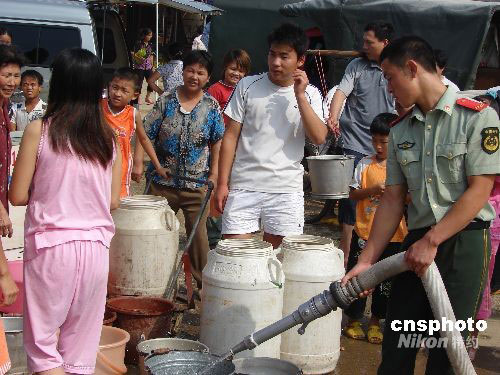8月30日至9月1日,廣西柳州市柳城縣因水廠機(jī)器爆裂,造成縣城停水,4萬多人飽受缺水之苦。水廠方面稱目前仍在搶修,爭取盡快恢復(fù)供水。柳城消防官兵為當(dāng)?shù)孛癖娝退越馊济贾。中新社發(fā) 莫洪立 攝