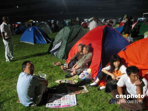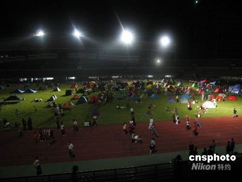 九月一日晚,上千名攀枝花市民在攀枝花體育場搭帳篷過夜。因害怕再次發(fā)生余震,許多市民從家里搬到了體育場內。體育場已免費向市民開放,并二十四小時提供熱水。中新社發(fā) 劉子倩 攝