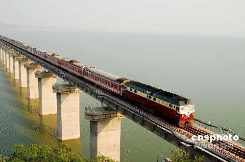 9月2日下午,一列客車從鄱陽湖鐵路特大橋上向九江駛?cè)ァ.斕欤每土熊囀状瓮ㄟ^鄱陽湖。自9月1日起,銅九鐵路先后開行南昌至南京、南昌至寧波、南京至武昌等方向旅客列車,江西境內(nèi)湖口、彭澤2個縣城從此結(jié)束不通旅客列車的歷史。據(jù)了解,客車開行后,從九江至南京比目前縮短近10個小時,從南昌至南京也比目前縮短近5個小時,南昌至寧波需繞道杭州的歷史結(jié)束,旅客出行更加方便、快捷。圖為9月2日16:45分左右,K506次南京至南昌旅客列車從鄱陽湖鐵路特大橋上駛過。中新社發(fā) 胡國林 攝