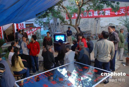 9月25日下午, 在山西運城市鹽湖區(qū)安邑街道辦事處楊家卓村景海鵬的老家,前來到賀喜的親戚朋友和當?shù)卣斫j繹不絕。中新社發(fā) 張雷杰 攝