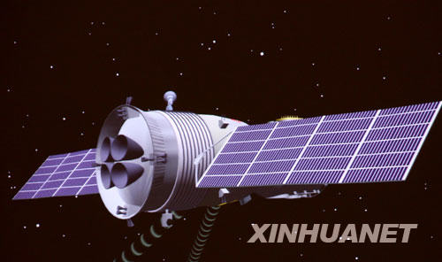 這是神舟七號載人飛船在太空遨游的模擬圖(9月27日10時06分44秒攝于北京航天飛行控制中心)。 新華社記者 陳建力 攝