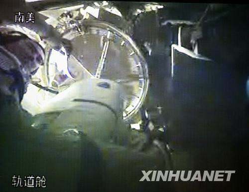 9月27日,航天員翟志剛在神舟七號(hào)載人飛船軌道艙進(jìn)行出艙前的準(zhǔn)備工作(攝于北京航天飛行控制中心大屏幕)。當(dāng)日中午,航天員出艙活動(dòng)任務(wù)開(kāi)始。新華社記者查春明攝