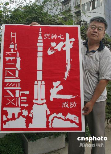9月27日,江蘇徐州市民間工藝美術(shù)師陳永年用一天半時間,剪出了“賀神七沖天成功”和翟志剛、劉伯明、景海鵬三位航天員個人肖像剪紙畫,以此慶賀“神七”飛天成功。中新社發(fā) 人石 攝