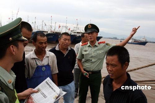 9月30日,邊防官兵在溫州飛云江漁港向待臺(tái)風(fēng)“薔薇”警報(bào)解除后出海的漁民通報(bào)外輪“HELIOS 3”號(hào)船在溫州南麂海域沉沒情況,提醒漁船在出海后注意發(fā)現(xiàn)遇險(xiǎn)人員及漂浮物。 9月29日下午2時(shí)許,在巴拿馬注冊(cè)的韓國(guó)貨輪“HELIOS 3”號(hào)船從緬甸載6000噸原木前往浙江嘉興港,在航經(jīng)溫州南麂島以南約5海里處時(shí),受臺(tái)風(fēng)“薔薇”影響,船上貨物移位,造成兩艙進(jìn)水發(fā)生險(xiǎn)情后沉沒,船上共有韓國(guó)、緬甸、印尼等國(guó)家地區(qū)的外籍船員15名。海上搜救部門立即啟動(dòng)應(yīng)急預(yù)案,當(dāng)晚有2名外籍船員在救生筏上被一艘路過(guò)的船舶救起,其余13名遇險(xiǎn)外籍船員仍在搜尋之中。中新社發(fā) 蔡寬元 攝