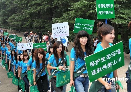 2008年10月3日,參加“中國國際年度綠色風(fēng)云人物”頒獎盛典暨“MISS EARTH世界綠色環(huán)保大賽中國總決賽”的來自全國27個省、直轄市、自治區(qū)的40位“綠色天使”手拿宣傳牌、環(huán)保袋等物品來到南京中山陵風(fēng)景區(qū),參加公益環(huán)保宣傳活動。中新社發(fā) 劉建民 攝