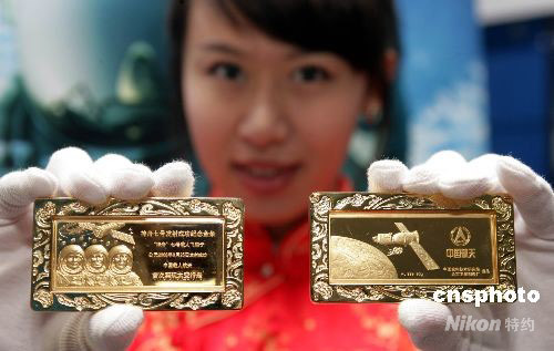 10月9日,為紀(jì)念神舟七號成功發(fā)射和中國首次太空行走圓滿成功,作為國家紀(jì)念 “神七”飛天活動(dòng)的重要組成部分,中國航天部門首次面向全球發(fā)行“金鑲鉆神七金條”!敖痂傘@神七金條”分45克、90克、300克和1000克四種規(guī)格,全部采用999純黃金制作,正面的主體圖案為三位宇航員肖像,背面為神七飛船和宇航員出艙行走的風(fēng)姿,這在中國航天史上尚屬首次。中新社發(fā) 趙雋 攝