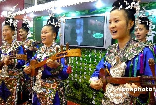 10月13日,正在北京舉行的第五屆中國國際茶業(yè)博覽會(簡稱第五屆茶博會)吸引眾多商家和參觀者,是次由中國商務部外貿(mào)發(fā)展局、中國土產(chǎn)畜產(chǎn)進出口總公司聯(lián)合主辦的茶博會推出中國茶樣大巡展"活動、"有機"名優(yōu)茶評選、世界茶文明之旅以及豐富多采的茶藝表演大賽暨"世界茶文明之旅---中華茶藝之星"選拔大賽。圖為在茶博會上來自中國貴州參展團的少數(shù)民族茶藝文化表演隊為參觀者表演當?shù)孛褡甯栉琛V行律绨l(fā) 錢興強 攝