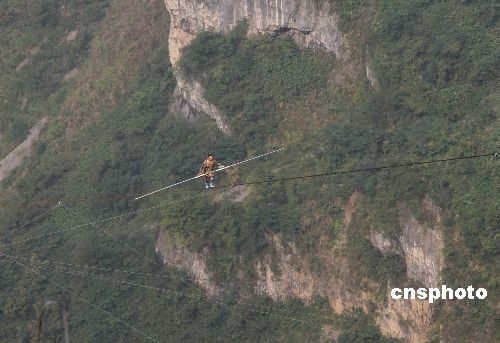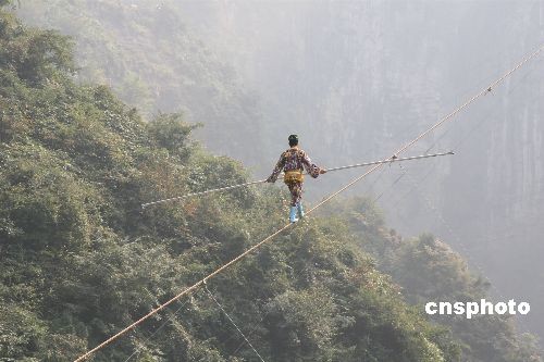 18日,“高空王子”阿迪力的親侄子賽買提·艾江在張家界天門山的萬仞絕壁之間展示了“達(dá)瓦孜”的驚人絕技。雖然賽買提在最后50米處意外“失手”,被救援人員接回終點,但在傾斜達(dá)39度的鋼繩上行走了650米,已經(jīng)成功挑戰(zhàn)了世界最大斜度的高空走鋼絲極限!斑_(dá)瓦孜”意思是“高空走繩索”,是新疆維吾爾族歷史悠久的民間傳統(tǒng)絕技。中新社發(fā) 鄧霞 攝