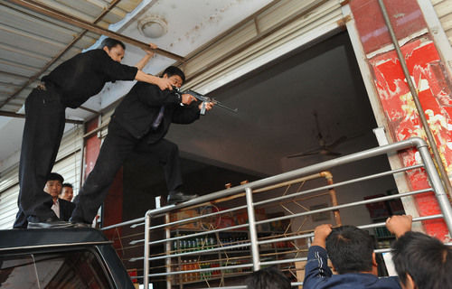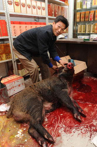 2008年10月23日,安徽省桐城市警方將闖進(jìn)小鎮(zhèn)商店的三頭野豬擊斃。當(dāng)天早晨,3頭野豬闖進(jìn)桐城市青草鎮(zhèn),連傷4人,當(dāng)?shù)鼐浇泳髮⑦@“一家三口”擊斃。