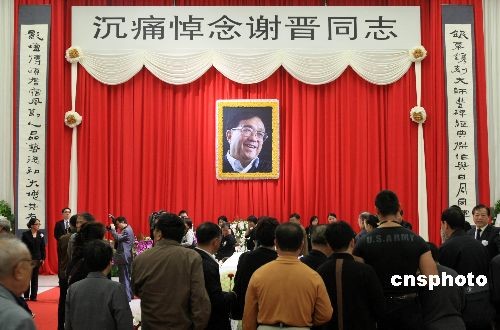 10月26日,中國著名導(dǎo)演謝晉追悼儀式在上海龍華殯儀館舉行,社會各界人士自發(fā)到場為一代電影大師送行。謝晉導(dǎo)演于10月18日凌晨在浙江上虞去世,享年85歲。他生于1923年,浙江上虞市人,主要代表作有《女籃5號》、《紅色娘子軍》、《牧馬人》、《天云山傳奇》、《鴉片戰(zhàn)爭》、《芙蓉鎮(zhèn)》等。中新社發(fā) 湯彥俊 攝