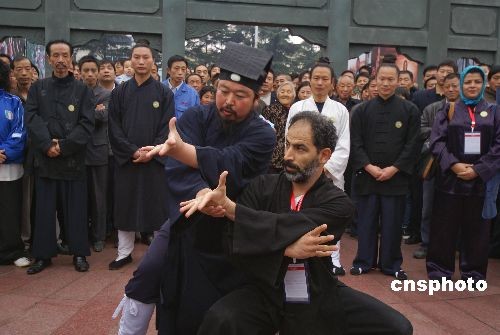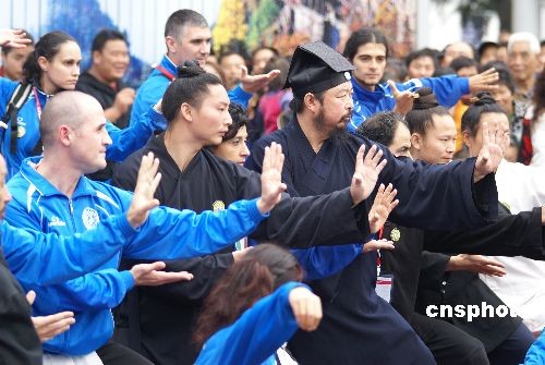 10月29日,第三屆世界傳統(tǒng)武術(shù)節(jié)在湖北十堰市舉行,來自69個國家和地區(qū)的165個代表隊的2000多名武術(shù)愛好者匯聚湖北十堰。當(dāng)日上午,來自世界各地的洋弟子們在十堰市人民廣場拜武當(dāng)派第14代掌門、武當(dāng)派武術(shù)的代表人物游玄德道長為師,并進行武術(shù)表演。中新社發(fā) 稅曉潔 攝