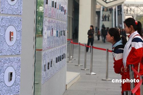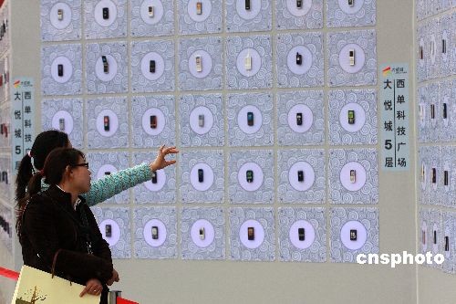 11月4日,北京西單大街,一面長(zhǎng)約30米的手機(jī)墻引來(lái)不少路人駐足欣賞。墻面上擺放著各種品牌款式的時(shí)尚手機(jī),讓原本時(shí)尚的西單大街更添幾分色彩。中新社發(fā) 鄭雄增 攝