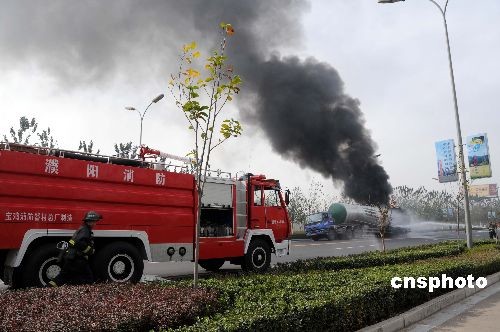 11月5日上午,位于河南省濮陽市濮鶴高速收費站東一公里處,一輛從河北省邯鄲市往濮陽市運輸散裝水泥原料潮石粉的歐曼重型卡車剛下高速公路,正在行駛時突然發(fā)生輪胎著火事故。在當?shù)叵拦俦目焖偬幹孟拢馂?zāi)得到及時撲滅。中新社發(fā) 劉敬寬 攝