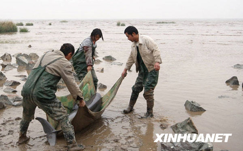 11月12日,3位漁民借助棉被將擱淺江豚轉(zhuǎn)移到安全地帶。 當(dāng)日,在杭州灣海鹽段灘涂,一條擱淺江豚在3位漁民的及時幫助下,重回大海。新華社發(fā)