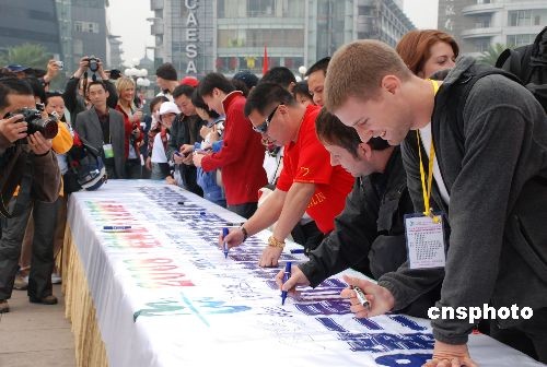 圖為中外徒步愛好者在啟動(dòng)儀式簽字。