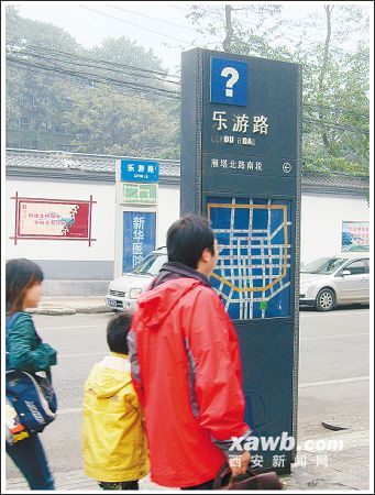 18日下午,大雁塔附近的育才路路口一個約2米高的黑色簇新路牌引人注目,不時有游客打扮的人上前查看道路信息。但是,路牌“育才路”三個漢字上方標示的一個大大的白色“?”號,引起了不少查看者的疑惑。兩名游客先是在路牌下方的城區(qū)交通旅游圖上尋找著“育才路”的方位,而后又仰頭看著“大問號”撓起了頭:“咱們現(xiàn)在是在育才路上嗎?這不會是表示路名待定吧……”