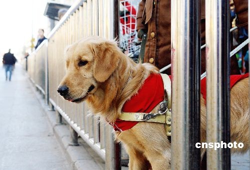 2008年11月25日,河南鄭州市首條經(jīng)過專業(yè)訓練的導盲犬“福娃”在街頭做準備練習。預計“福娃”年底即可上崗,也需要市民們的寬容協(xié)助。中新社發(fā) 馬健 攝