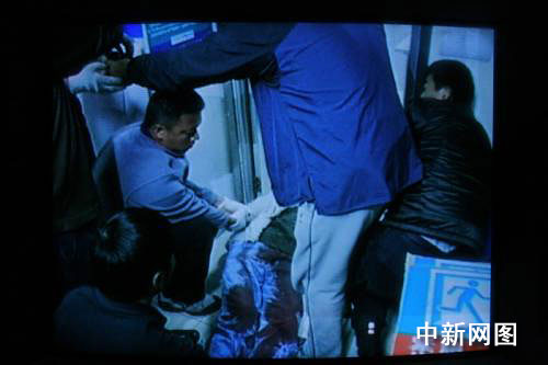 11月29日上午9時(shí)37分,一男子手持匕首在昆明市龍泉路家樂(lè)福超市持刀刺傷2名顧客和一名促銷(xiāo)員,隨后將一名趕來(lái)現(xiàn)場(chǎng)救治傷員的醫(yī)護(hù)人員挾持。經(jīng)查,該男子名叫陸志文,39歲,此前曾有犯罪前科。圖為該男子被警方擊斃。