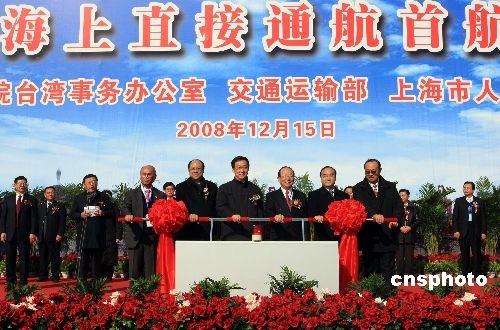 12月15日,海峽兩岸海上直接通航首航儀式在上海洋山港舉行,中遠(yuǎn)公司的“遠(yuǎn)河”號和中海公司的“新非洲”號從洋山港啟航執(zhí)行首航任務(wù)。當(dāng)日,海峽兩岸海上、空中直航及直接通郵在兩岸同步啟動。中新社發(fā) 湯彥俊 攝