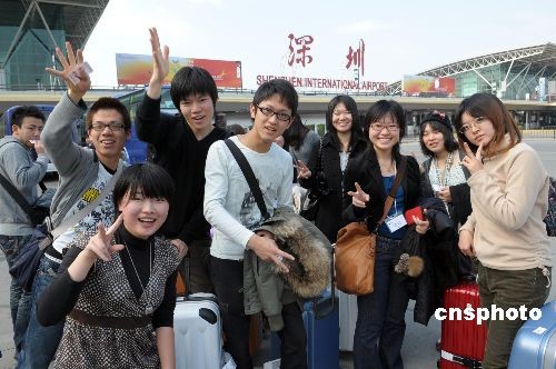 十二月二十一日,日本青少年世代友好代表團一行百余人抵達深圳,他們將前往紅樹林、錦繡中華、民俗文化村、深圳大學、大族激光等處參觀。圖為日本大學生抵達深圳機場時高興地合影留念。中新社發(fā) 陳文 攝