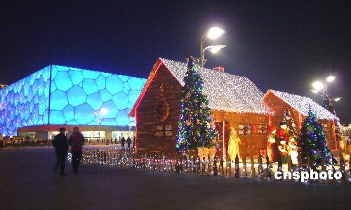 2008年12月23日晚,北京奧運(yùn)公園109棵圣誕樹(shù)及圣誕小屋與“鳥(niǎo)巢”“水立方”交相輝映,構(gòu)成一幅璀璨迷人的畫(huà)卷,充滿濃郁的節(jié)日氛圍。中新社發(fā) 玉龍 攝