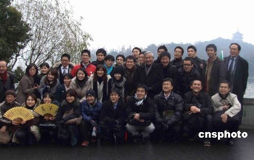 12月24日上午,日本青少年友好使者代表團一行38人搭船游覽杭州西湖,在“三潭映月”合影。新田理惠小姐表示:“早就聽說西湖很美,果然很讓我驚喜。雖然不是晴天,但是現(xiàn)在的西湖讓人覺得特別寧靜內(nèi)斂。”中新社發(fā) 周翌 攝