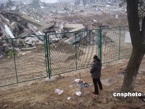 2009年元旦節(jié),四川大地震極重災(zāi)區(qū)的北川縣曲山鎮(zhèn)一位母親,清晨到北川中學(xué)地震遺址上香,悼念在此失去生命的兒子。中新社發(fā) 賈國(guó)榮 攝