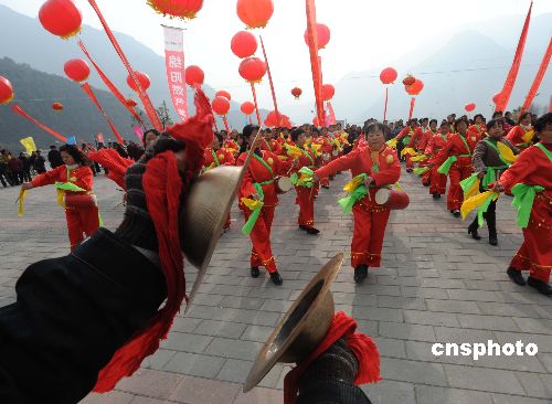 四川汶川大地震極重災區(qū)北川縣擂鼓鎮(zhèn)由災民組成的腰鼓隊,2009年元旦節(jié)日期間載歌載舞,在余震中辭舊迎新。據(jù)四川省地震臺網(wǎng)測定,1月2日晚7時,四川省綿陽市北川縣又發(fā)生一次4.7級地震,這次余震持續(xù)時間較短,但成都市區(qū)、眉山市、德陽市等地有明顯震感。中新社發(fā) 賈國榮 攝