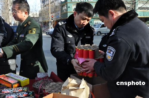 1月23日,為確保春節(jié)安全,鄭州市公安局金水分局組織治安、消防大隊(duì)、轄區(qū)派出所,全面展開(kāi)對(duì)煙花爆竹違規(guī)燃放、販運(yùn)和銷(xiāo)售煙花進(jìn)行嚴(yán)格檢查。截至目前,共清查集貿(mào)市場(chǎng)、街道鄉(xiāng)村攤點(diǎn)317余處。中新社發(fā) 劉書(shū)亭 攝