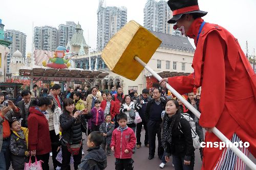 一月二十六日,中國(guó)農(nóng)歷大年初一,深圳歡樂(lè)谷、世界之窗、紅樹(shù)林海濱公園、東部華僑城等旅游景區(qū)游人如織。圖為深圳歡樂(lè)谷滑稽演員與游客同樂(lè)。中新社發(fā) 陳文 攝
