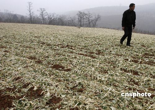 2月2日,河南省洛陽市宜陽縣趙堡鄉(xiāng)農(nóng)民看著滿地干旱蔫黃的油菜,十分無奈。2月2日凌晨,當(dāng)?shù)貧庀蟛块T實施了多批次人工增雨雪作業(yè),作業(yè)區(qū)內(nèi)普降小雨,一定程度上緩解了當(dāng)?shù)厣只痣U等級,但因為雨量過小,基本于旱情無補。 目前,河南省遭遇1951年以來的特大旱情,全省受旱面積已經(jīng)達到了63.1%,其中包括洛陽在內(nèi)的豫西地區(qū)尤為嚴重。河南省氣象局1月29日15時發(fā)布干旱紅色預(yù)警,預(yù)計未來一周內(nèi)河南大部分地區(qū)干旱仍將持續(xù)。 中新社發(fā) 張曉理 攝
