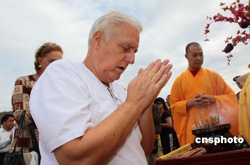 2月9日元宵節(jié),海南三亞南山寺全體僧眾在三亞南山文化旅游區(qū)內的108米南海觀音圣像前舉行祈福法會,共唱佛贊,并放飛和平鴿,祈愿國泰民安、萬家團圓。本次祈福法會吸引了近3000多名信眾和游客參加。中新社發(fā) 陳文武 攝