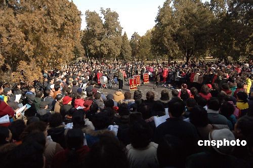 2月13日,北京天壇公園內(nèi)一支有上千名中老年人參與的心連心合唱團(tuán)共同引吭高歌懷舊歌曲。目前北京一些大公園都有心連心合唱團(tuán)的活動(dòng)。中新社發(fā) 鄒憲 攝