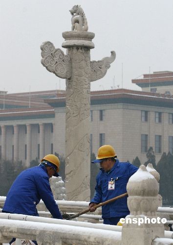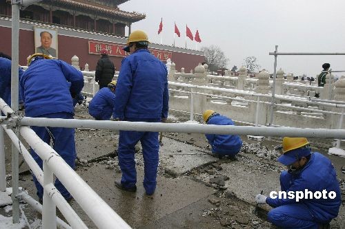 2009年2月18日,為迎接新中國成立60周年,天安門管委會開始對金水橋?qū)嵤┍Wo(hù)修繕工作,工程擬于2009年5月1日前完工,并整體對外開放。據(jù)悉,此次修繕工作將分階段進(jìn)行,由于施工圍擋防火板高度有限,因此金水橋和天安門城樓的整體景觀和游覽不會受到太大影響。中新社發(fā) 魯谷 攝