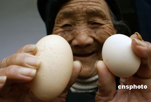 2月24日,山東省棗莊市山亭區(qū)北莊鎮(zhèn)后峪村76歲老人秦傳蘭家的一只母雞產(chǎn)下一枚重127克的巨型蛋,該雞蛋長約8厘米,重127克,有3個普通雞蛋大。中新社發(fā) 王森王 攝