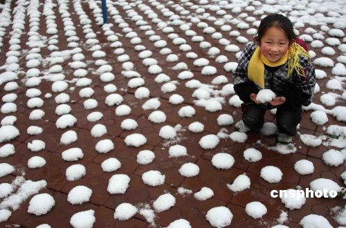 2月26日,河南省洛陽(yáng)市洛寧縣興寧公園7歲的佳琦在玩弄地上的積雪,團(tuán)團(tuán)的白雪好象一個(gè)個(gè)白饃,十分可人。中新社發(fā) 曾憲平 攝
