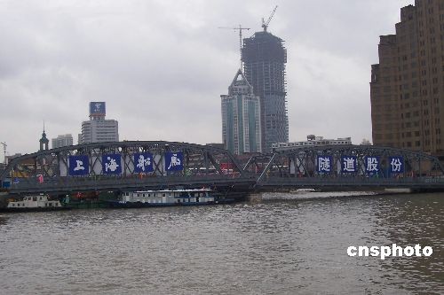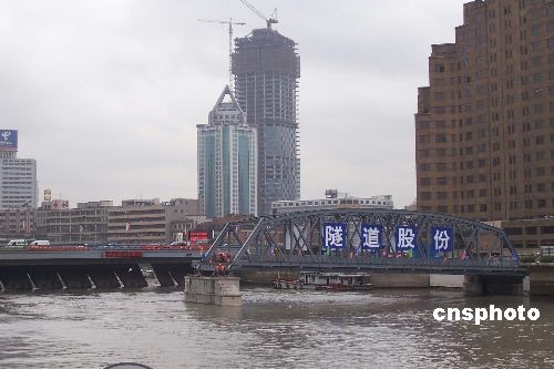 2月26日下午,上海外白渡橋南北兩跨橋體正式合攏,離別10個(gè)月修繕的百年外白渡橋回到了蘇州河。中新社發(fā) 周東潮 攝