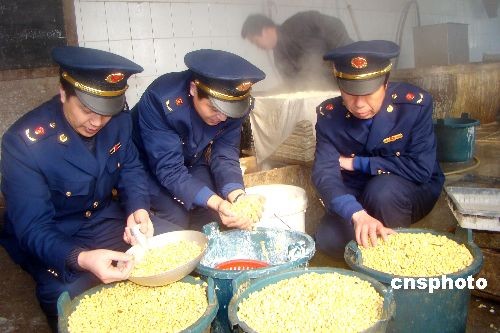 2月27日,江蘇連云港市連云工商分局執(zhí)法人員突擊行動,在連云區(qū)院前路當(dāng)場端掉正在生產(chǎn)豆腐的兩個黑窩點。工商執(zhí)法人員當(dāng)即查封了這兩家豆腐作坊,封存了生產(chǎn)工具,并責(zé)令限期整改。中新社發(fā) 王春 攝