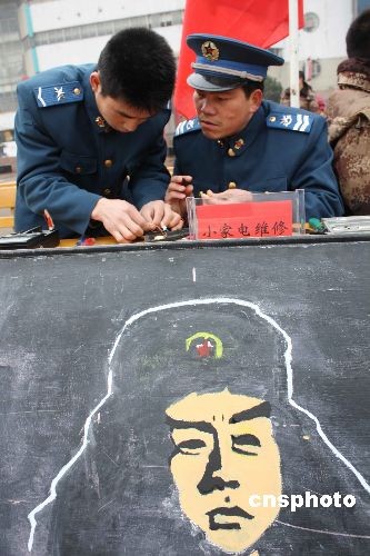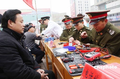 3月5日,青年志愿者在蚌埠火車站廣場參加“學(xué)雷鋒”獻(xiàn)愛心便民服務(wù)活動。當(dāng)日是全國“學(xué)雷鋒日”,共青團(tuán)安徽蚌埠市委舉行了“爭做志愿者、創(chuàng)造新生活”為主題的志愿服務(wù)統(tǒng)一行動,部隊(duì)、機(jī)關(guān)、學(xué)校、醫(yī)院、企業(yè)等二十多個(gè)單位組成多個(gè)青年志愿便民服務(wù)隊(duì),深入駐地農(nóng)村、街道、社區(qū)、敬老院、兒童福利院等地,積極開展醫(yī)療巡診、法律咨詢、計(jì)生宣傳、心理咨詢、環(huán)保宣傳、家電維修、安全消防、用電知識等多種服務(wù)活動。中新社發(fā) 耿國慶 攝