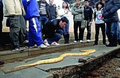 中新網(wǎng)3月15日電 湖南杜甫江閣北邊江邊趴著一條金黃色的蟒蛇,這條蟒蛇長約1.5米,有成年男子手臂那么粗,蛇皮呈金黃色,有些微微的腫脹,好像被水浸泡過,看上去似乎已經(jīng)死了,很多群眾自發(fā)地把現(xiàn)場保護起來。