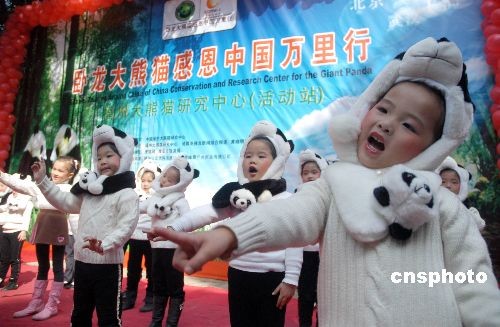 2009年3月15日,為了感謝各地對(duì)臥龍大熊貓的愛心援助,在汶川地震發(fā)生即將一周年之際,由四川臥龍中國保護(hù)大熊貓研究中心主辦的“感恩世界點(diǎn)亮希望 臥龍大熊貓感恩中國萬里行”活動(dòng)福州站在福州熊貓世界舉行。中新社發(fā) 張 斌 攝