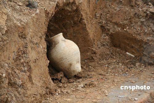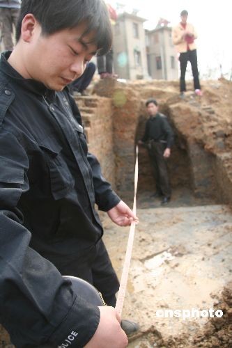 3月16日,施工人員在正在興建的安徽巢湖北外環(huán)施工工地發(fā)現(xiàn)兩座古墓。發(fā)掘的兩座古墓被確證為東漢晚期墓,其中一古墓葬為土坑墓,另一座為磚坑墓。據(jù)該市文管所同志介紹,這兩座漢墓均被盜過,而且被盜一空,在發(fā)掘時,發(fā)現(xiàn)盜墓賊留下一個很大的盜洞,直通墓中央。從盜墓賊盜墓的舉動和第二座漢墓墓磚結(jié)構(gòu)及墓磚上的花紋判斷,此墓墓主應(yīng)該有些身份,多少有些隨葬品,然而,發(fā)掘人員除了發(fā)掘出一些瓦罐的碎片,挖出惟一一只完整的陶罐。此只陶罐不是在墓坑挖出的,而是在墓坑外二十公分處。據(jù)文管所同志分析,此罐可能是后人祭祀留下的,或是盜墓賊丟下的。中新社發(fā) 李遠(yuǎn)波 攝