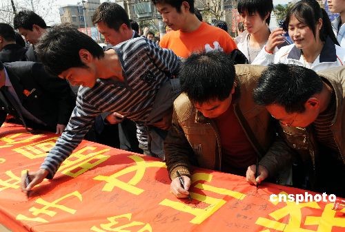 3月18日,安徽亳州市舉辦“我與文明同行”簽名活動(dòng),近千市民和部隊(duì)官兵在橫幅上簽名,倡導(dǎo)市民為城市創(chuàng)造文明、衛(wèi)生、和諧、有序的社會(huì)環(huán)境。中新社發(fā) 張延林 攝